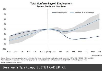 Для скептиков ниже похожий график, который отслеживает уровень суммарной безработицы до и после декабря 2009 по сравнению со средней занятостью до и после рецессии в течение предыдущих пяти спадов: