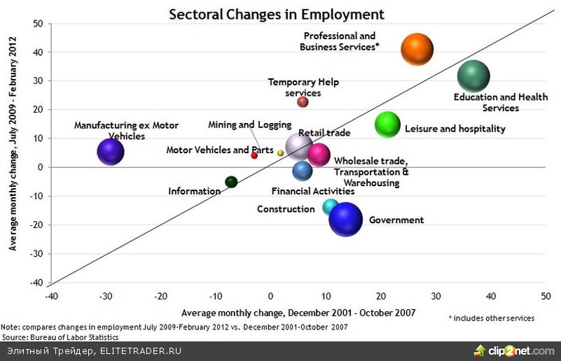 Несложно увидеть, что на этом графике картинка рынка труда очень близка к «нормализированной», исключая те секторы, которые сталкиваются с долгосрочными проблемами. Во-первых, большая часть секторов-шаров на графике – лежат выше горизонтальной нейтральной оси, что означает, что они сейчас в позитивной территории роста во время этого восстановления. Во-вторых, большая часть шариков выравнивается вдоль 45-градусной линии, что означает, что рабочие места в этих зонах растут (или в случае информационного сектора, сокращаются) тем же темпом, что и до «Великой Рецессии». В-третьих, исключения ровно те, что мы и ожидали – занятость в секторе строительства, финансовой активности и государственных секторах продолжает падать, а производственный сектор слегка растет.