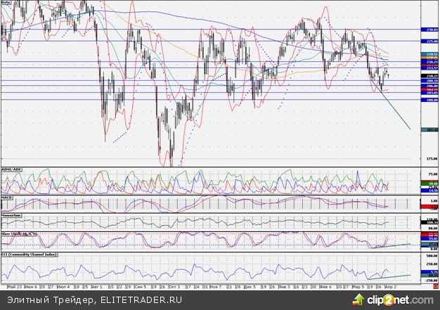 Акции «Роснефти» последние несколько сессий демонстрируют восходящую динамику. Стоит отметить, что между графиком цены и осцилляторами: медленный Stochastic (10;3;3) и CCI (9), наблюдается дивергенция, что может свидетельствовать о снижении «медвежьей» активности. Кроме того, накануне график акций снизу вверх пересекся с графиком индикатора Parabolic Sar, что говорит о возможном формировании восходящей динамики. Также сужение канала Bollinger Bands говорит о вероятной смене нисходящего тренда. Таким образом, высока вероятность того, что «быки» в ближайшее время могут перехватить инициативу в свои руки. В случае продолжения восходящего движения ближайшим уровнем сопротивления по бумагам является важная отметка 220,00 руб., чуть ниже которой проходит 200-дневная скользящая средняя. В случае пробития уровня сопротивления слудующей целью по бумагам может стать уровень 225,00 руб., данный уровень в середине марта был долгое время значимым уровнем сопротивления.