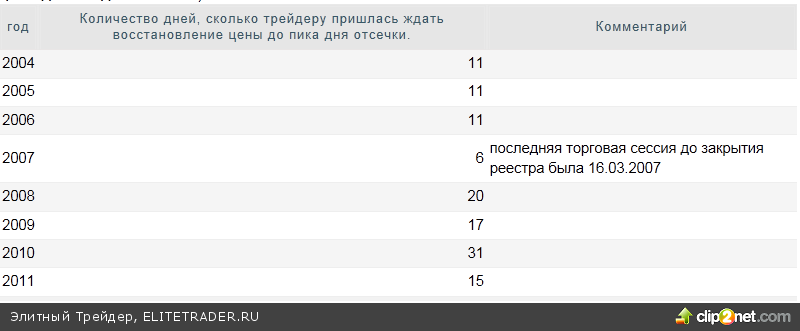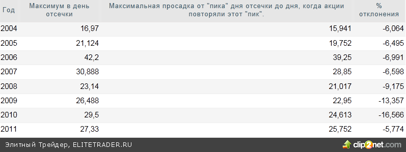 Если привести статистику с 2004 по 2011 год, то в среднем получается, что подождав 15,25 дня, можно было продать акции по той же цене, которая была максимальной для дня закрытия реестра. Максимальная просадка за этот срок достигала 16,566%, а в среднем составляла 8,87%.