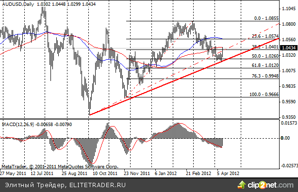 Н4. Если растянуть Фибо на все нисходящее движение ($1,0854 - $1,0225), то видно, что цена подходит к уровню 38,2%. Так же пробито сопротивление, которое сдерживало рост цены с 29 февраля этого года и оба мувинга (SMA 55, SMA 89). Рискованно можно продать пару от уровня 1,0464 (максимум 3 апреля 2012г.), который совпадает с 23,6% Фибо. Если в течение пятницы цена не достигнет уровня открытия позиции, отложенный ордер стоит удалить.