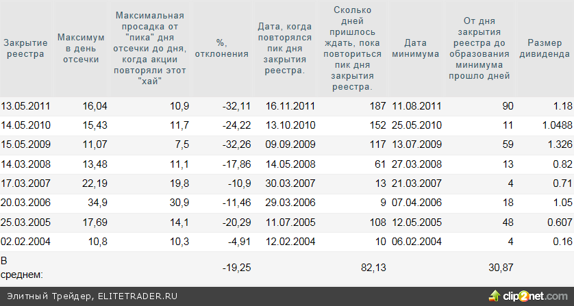 Знакомая таблица, с небольшим дополнением. Теперь я вычисляю, через сколько в среднем дней после закрытия реестра формировался минимум, от которого цена стремилась вернуться к пику дня отсечки.