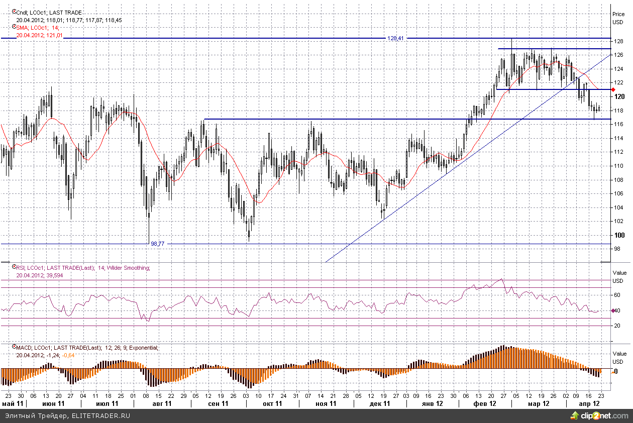 На этой неделе поступательное снижение котировок продолжилось, котировки фактически опустились к ранее озвученному диапазону поддержки на 115,5-116,5 долл. Именно эта зона выступает областью торможения, пройти ниже в ближайшей перспективе скорее всего не удастся.