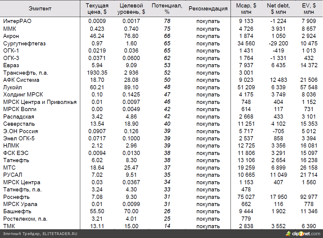 Мы несколько изменили наш подход к выставлению топ-рекомендаций, а именно разделили эти рекомендации на два списка. В первый список (инвестиционный портфель) мы включаем акции компаний, которые считаем наиболее подходящими для долгосрочных инвестиций. Основные характеристики этих компаний – относительно высокие стандарты корпоративного управления, разумная долговая политика, нацеленность на рост и создание стоимости для акционеров, разумная оценка. Во второй список (top-picks) мы включаем акции компаний, в которых видим краткосрочные спекулятивные идеи. На сегодняшний день эти портфели выглядят следующим образом: Инвестиционный портфель – Лукойл, Татнефть, ММК, Евраз, Акрон, МТС, E.ON Россия. Спекулятивные идеи – Сургутнефтегаз, Транснефть прив., Русал, Акрон.