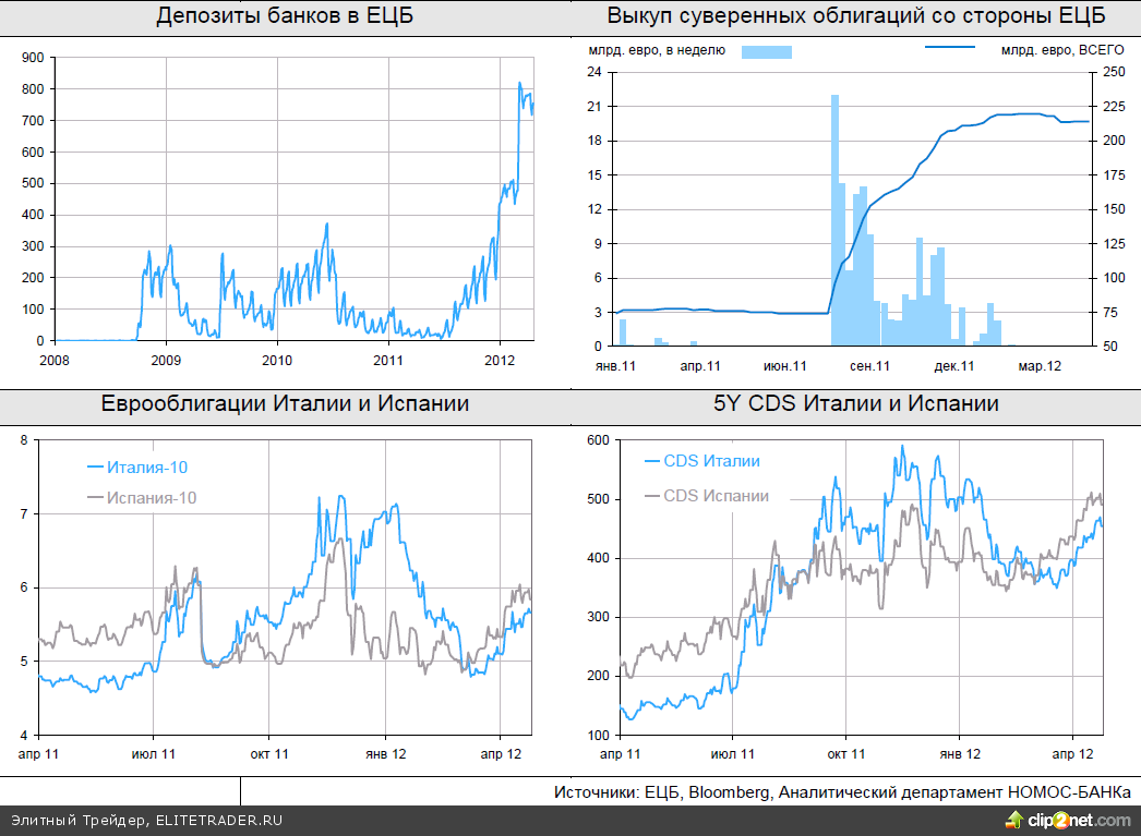 Масштабная кредитная накачка банковского сектора, осуществленная ЕЦБ в ходе двух аукционов LTRO в декабре 2011 г и феврале 2012 г, сбила накал страстей на финансовых рынках, но не смогла переломить негативные тренды в экономике. В отличие от США, где программы монетарного стимулирования запустили экономический рост, Европа не может выйти на траекторию восстановления. Судя по последней статистике, экономический спад в Европе, усиливается, и это обстоятельство ставит под сомнение возможность решения проблемы суверенных долгов. Сокращение бюджетных расходов европейскими правительствами ведет к спаду в экономике, и соответственно к падению бюджетных доходов. Получается замкнутый круг, для выхода из которого требуются все новые стимулы.