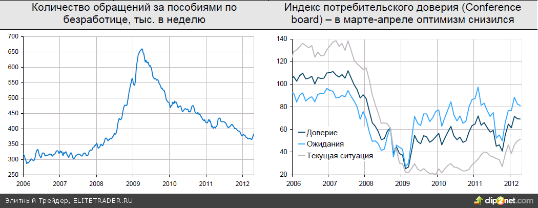По нашему глубокому убеждению, базирующемуся на многолетнем наблюдении за американской статистикой, наиболее надежными и оперативными индикаторами состояния дел в экономике США являются еженедельный и ежемесячный отчеты по рынку труда. Именно эти отчеты, выходившие в апреле, вызывают тревогу. О некотором замедлении темпов восстановления рынка труда заявляет и ФРС, хотя и прогнозирует снижение безработицы ниже 8 % к концу года (сейчас - 8.2 %)