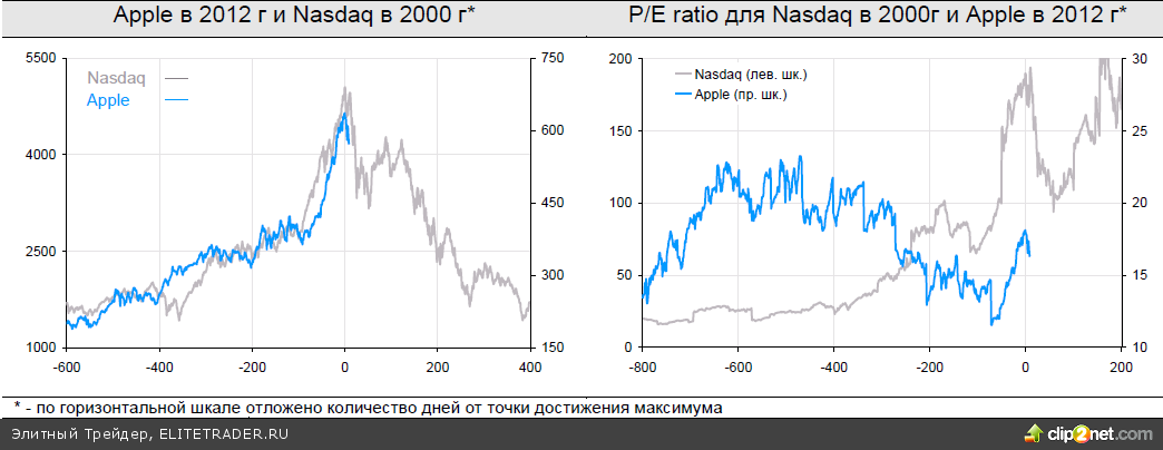 Динамика акций Apple напомнила события двенадцатилетней давности, когда взорвался пузырь «доткомов» на американском фондовом рынке. Действительно, наложенные друг на друга графики (см. ниже) демонстрируют очень высокую степень совпадения. Однако в этих сравнениях есть одно принципиальное различие - в отличие от Nasdaq в 2000 г, Apple не выглядит сейчас явно переоцененным (см. график внизу справа). P/E ratio Apple сейчас вдвое ниже аналогичного показателя Nasdaq в начале нулевых, при этом сама компания в отличие от большинства «доткомов» начала нулевых имеет устойчивую бизнес-модель, растущий денежный поток и более $ 100 млрд. наличности.
