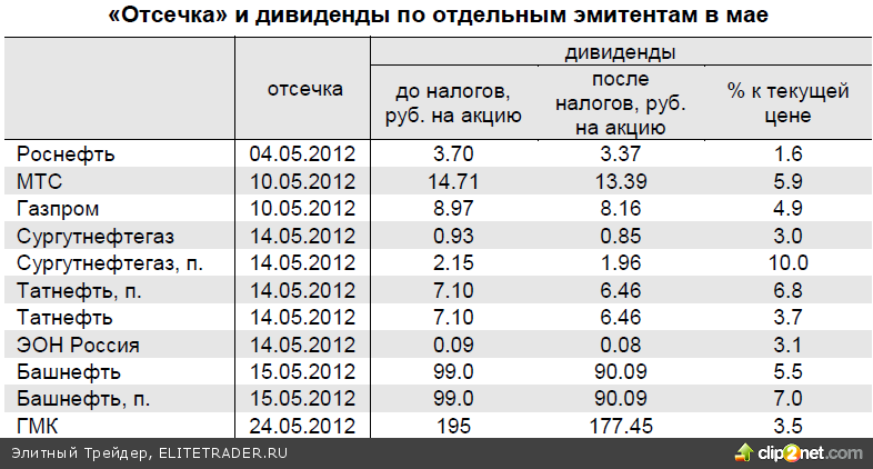 Так что если Вы хотите дождаться в этих бумагах дивидендов и выйти после отсечки, будьте готовы к тому, что такая тактика на этот раз не сработает, и дивиденды не смогут компенсировать потери от изменения котировок. На наш взгляд, более правильной тактикой была бы покупка этих бумаг после закрытия реестра на падении, которое, скорее всего, будет больше, чем размер дивидендов.