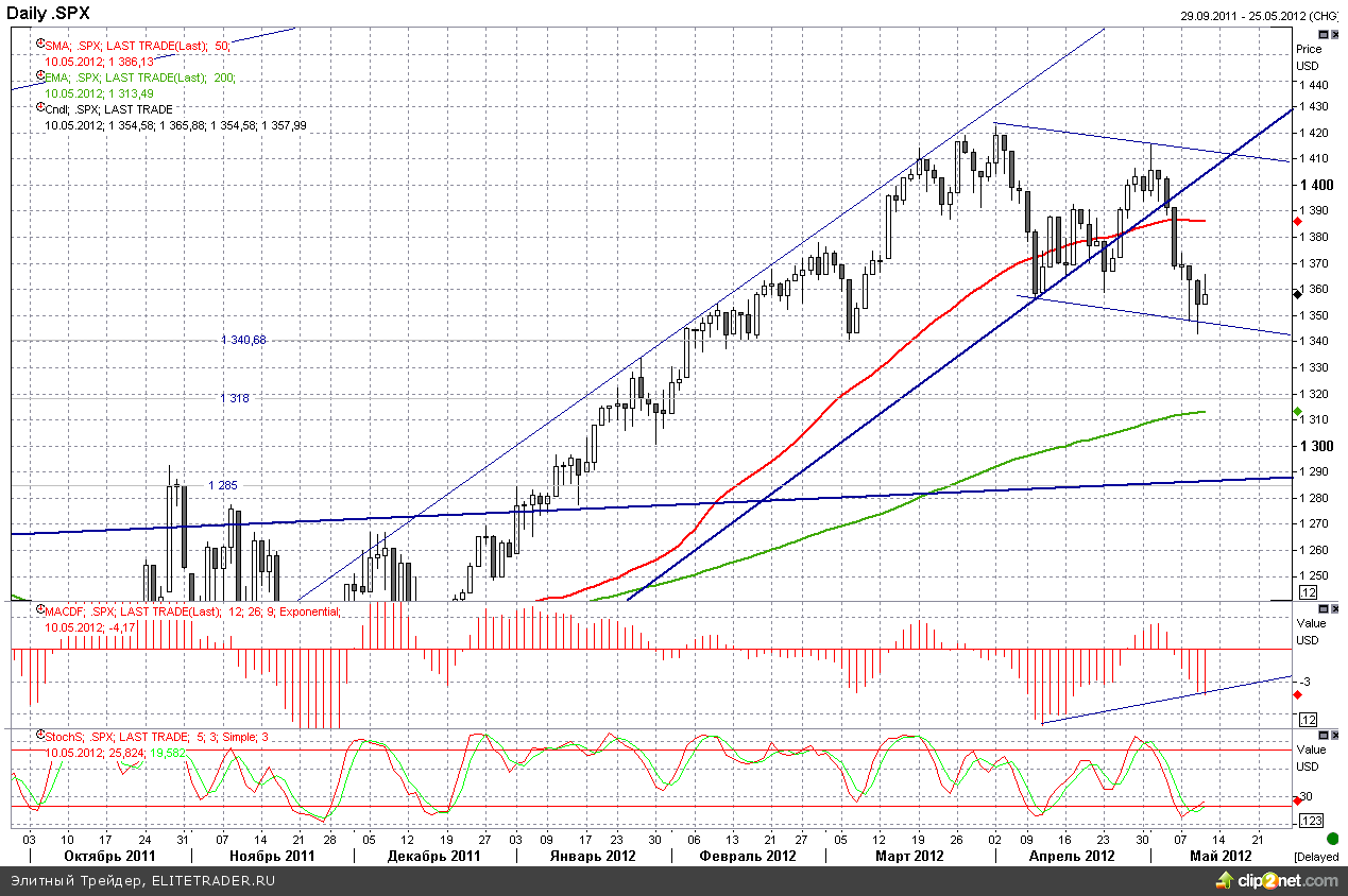 Едва ли можно назвать вчерашний прирост по индексу S&P500 продолжением отскока от важного сопротивления на 1340 пунктов. Индикатор прибавил четверть процента на умеренно-оптимистичной статистике и ожиданиях стабилизации ситуации с обострившимися опасениями за судьбу Еврозоны на фоне политических рисков в Греции и Франции.