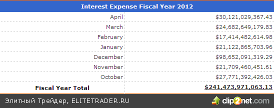 При этом процентные выплаты по американскому госдолгу в апреле оказались самыми крупными в календарном 2012 году, превысив $30 млрд.