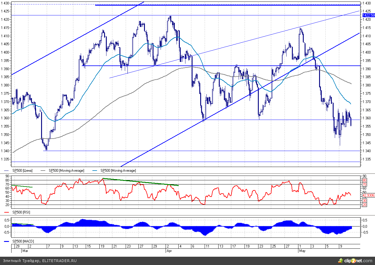 В четверг индекс широкого рынка консолидировался на ранее достигнутых уровнях. Инвесторов колеблются в рамках неопределенной ситуации, сложившейся на текущий момент. Несмотря на то, что совсем недавно S&P500 вышел из своего полугодового растущего канала, продолжения резкого нисходящего импульса мы не наблюдаем. Ключевой уровень 1360п. с легкостью проходится и вверх и вниз.