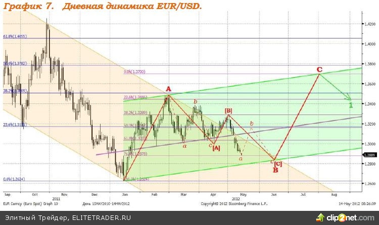 Валютная пара евро/доллар 11 мая была стабильна. В настоящий момент значение пары находиться вблизи линии поддержки, которая изображена на графике 6 синим цветом. Полагаем в понедельник, 14 мая, падение пары евро/доллар продолжится. Предполагаемая структура движения котировок валютной пары изображена на графиках 6 и 7. В ближайшее время соотношение единой европейской валюты и доллара США может достигнуть отметки 1,2860, после чего котировки евро/доллар могут пойти вверх. Ориентир роста значение 1,3150