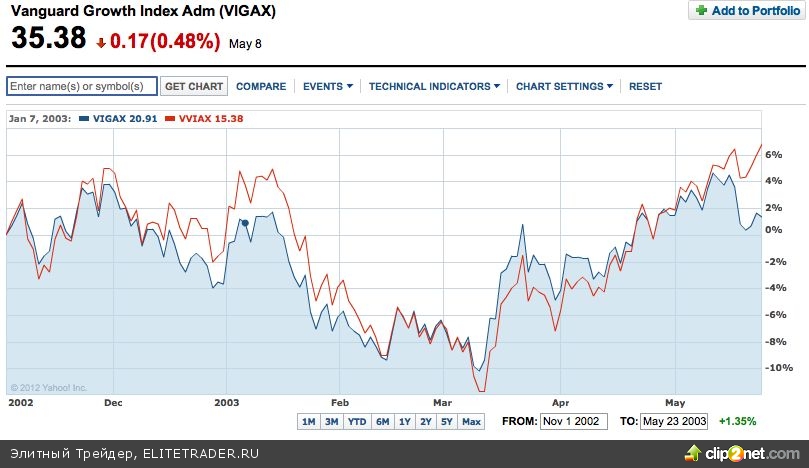 Кроме того, эти вещи можно проверить и на практике. Например, можно отследить динамику рынка в 2003 году, когда были введены налоговые льготы. Рассмотрим индекс Vanguard Value Index, который показывает высоко-дивидендные акции, и Vanguard Growth Index, показывающий динамику акций с невысокими дивидендами.