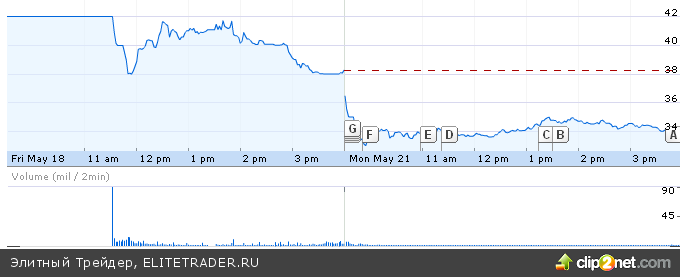 Что касается акций Facebook, усилий Morgan Stanley удерживающем бумагу в первый день от пробоя вниз уровня размещения в $38, судя по торгам вторника хватило не на долго. Котировки рухнули к $33 в первый час торгов. К концу сессии доллар все таки удалось отыграть, а итоговые потери составили почти 11%. Объемы уже не были столь фантастичными как в понедельник, но почетное второе место среди американских акций они заняли во вторник после BofA, с оборотом 168,309,831