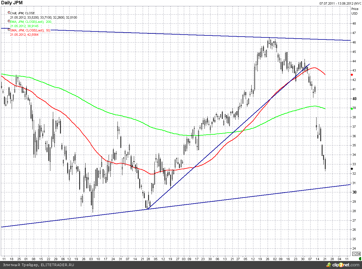 В частности индекс широкого рынка S&P500 поднялся на 1,6%, закрывшись выше 200-дневной экспоненциальной скользящей средней. Более скромный рост по индексу голубых фишек Dow Jones объясняется как раз продолжающимися распродажами в акциях Bank of America (-2,71%) и JP Morgan (-2,93%). Проблемы последнего с анонсированными накануне убытками в $2-3 млрд от собственных операций приобретают все новые последствия. Акции JPMorgan потеряли уже более 20%, или $30 млрд. рыночной стоимости, после того как стало известно об убытках банка.