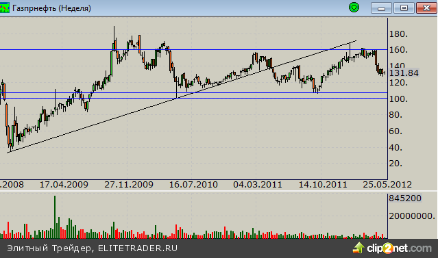 Акции Газпром нефти рассмотрим подробнее. Ниже представлен недельный график котировок по состоянию на закрытие 22 мая.