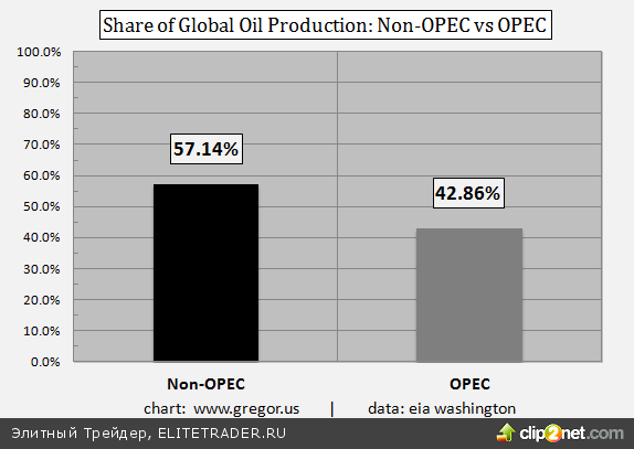 ОПЕК уже давно не имеет лидирующего положения на рынке нефти. График соотношения производства нефти – ОПЕК vs. не ОПЕК: