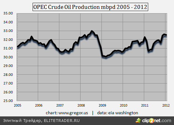 Как отчетливо видно на графике, производство нефти странами ОПЕК – это далеко не прогрессирующая динамика: