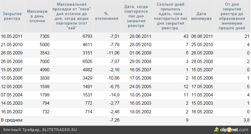 Пришло время познакомиться с дивидендной историей акции ГМК "Норильский никель". Я не стала изощряться и смотреть, как акции себя вели на промежуточных закрытиях реестра. Приведу данные по главным отсечкам года. Акции ГМК "Норильский никель" побили рекорды всех ранее представленных акций по скорости обновления пиков дня закрытия реестров. В среднем, всего 9 дней приходится ждать этого события, а среднее отклонение акций за этот период бывает 7,26%.