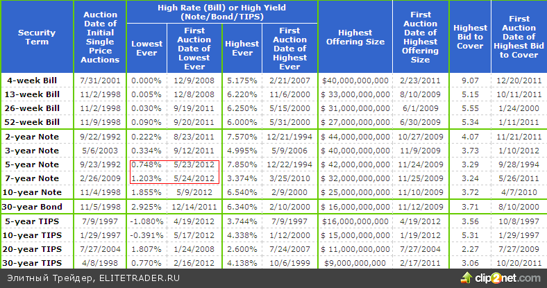 Нестабильность в рисковых активах, позволяет американскому правительству осуществлять заимствования все дешевле и дешевле не смотря на периодические возгласы участников рынка о пузыре в трежерис. Размещение 5-и и 7-и летних нот на текущей неделе на сумму $35 млрд и $29 млрд завершилось с исторически низкой доходностью. Семилетние облигации были проданы при доходности 1,203% и весьма неплохом коэффициенте Bid to Cover на уровне 2,8.