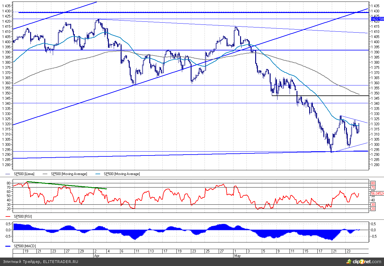 Для того чтобы разрешить эту дилемму необходимо дождаться выхода из сформированного в последние дни вымпела (фигуры продолжения тенденции между прочим). Пробой его нижней границы (1300-1305п.) приведет к началу новой фазы снижения с целью падения к уровню 1280п., где проходит достаточно сильная зона поддержки. Ну а что касается возможных перспектив роста, то пока даже выход из текущей формации не гарантирует существенный рост котировок, ближайшее сильное сопротивление расположено уже на 1345п.