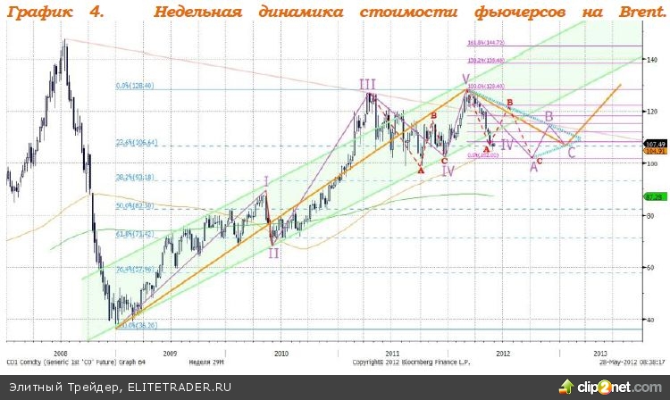 На фоне негативных настроений связанных с новым обострением проблем в Европе, а также на фоне спада экономического роста в Китае цены на нефть продолжили снижение. В долгосрочной перспективе видим продолжение снижения стоимости Brent. Во второй половине марта было завершено формирование фазы роста, которая началась с первых дней 2009 года. В настоящее время формируется коррекционное движение вниз, которое может быть в форме «плоской коррекции», как следует из графика 4. Снижение котировок Brent может достигнуть уровня $91