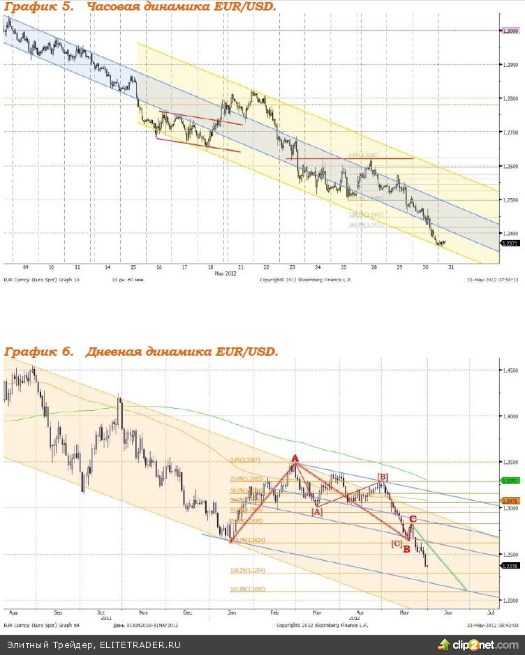 Ситуация в Европе и в мире в целом не дает поводов для оптимизма. Инвесторы опасаются испанского банковского кризиса и усиливающихся негативных тенденций в Азии. При этом, по мнению участников рынка власти не делают необходимого для предотвращения негативных тенденций. Вчера провалились котировки товарных активов, что создало благоприятный фон для дальнейшего укрепления доллара. Валютная пара евро/доллар обновила минимальное значение - 1,2358. Сегодня в ожидании новостей продавцы евро могут взять паузу, котировки евро/доллара стабилизируются в пределах 1,2360 - 1,2400. Сегодня публикуется большой блок статистических данных, в т.ч. ВВП США за 1 квартал, данные по безработице в «штатах», индексы деловой активности и цен на жилье. Также будет публиковаться большое количество статданных по странам еврозоны. Выходящая информация может повлиять на котировки валют и на настроения на рынке в целом. Если взглянуть более масштабно, значение валютной пары закончило формирование «плоской коррекции» А-В-С (график 6). Валютная пара продолжает оставаться в рамках нисходящего канала. Конечная цель снижения значения соотношения евро и американской валюты - 1,2100. Предполагаемая структура движения котировок евро/доллара изображена на графиках 5 и 6.