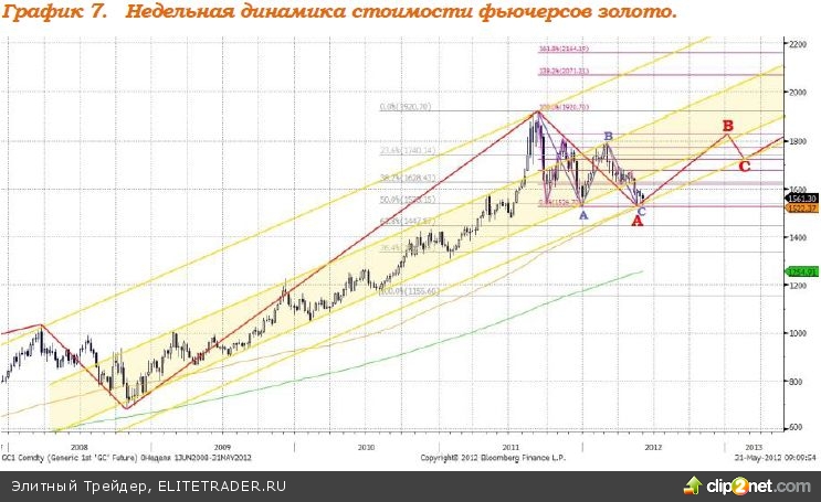 Высокая степень рыночных рисков стала причиной прекращения падения котировок золота на фоне повального падения на рынках. Драгоценный металл вновь стал выполнять функцию защитного актива, что может дать значительный импульс роста. Несколько последних торговых дней цена на драгоценный металл находится в пределах диапазона $1530 - $1590. В настоящий момент формируется волна роста «В» в рамках «плоской коррекции» А-В-С. Предполагаемая динамика развития ситуации изображена на графике 7, ориентиром повышения котировок золота служит уровень $1800.