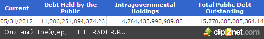 К слову сказать, по состоянию на 31 мая госдолг США достиг $15,77 трлн, из которых более 11 трлн приходится на все типы федеральных ценных бумаг, включая те, которыми владеет ФРС, правительство Америки и местные органы власти. Минфин ожидает, что объем госдолга достигнет «потолка» в 16,4 трлн долларов в период между ноябрем 2012 года и началом 2013 года.
