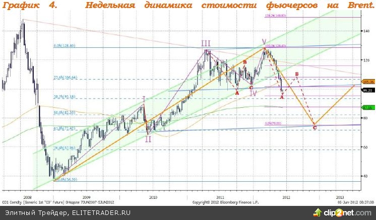 В среднесрочной перспективе, на фоне негативных настроений связанных с новым обострением проблем в Европе, а также на фоне спада экономического роста в Китае цены на нефть продолжили снижение. В долгосрочной перспективе видим продолжение снижения стоимости Brent. Во второй половине марта было завершено формирование фазы роста, которая началась с первых дней 2009 года. В настоящее время формируется коррекционное движение вниз, которое может быть в форме зигзага, как следует из графика 4. Снижение котировок Brent может достигнуть уровня $75.