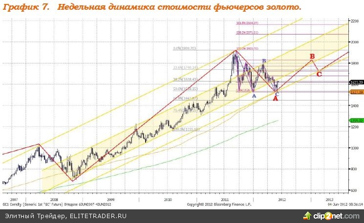 Высокая степень рыночных рисков стала причиной прекращения падения котировок золота на фоне повального падения на рынках. Драгоценный металл вновь стал выполнять функцию защитного актива, что может дать значительный импульс роста. Несколько последних торговых дней цена на драгоценный металл находится в пределах диапазона $1530 - $1590. В настоящий момент формируется волна роста «В» в рамках «плоской коррекции» А-В-С. Предполагаемая динамика развития ситуации изображена на графике 7, ориентиром повышения котировок золота служит уровень $1800
