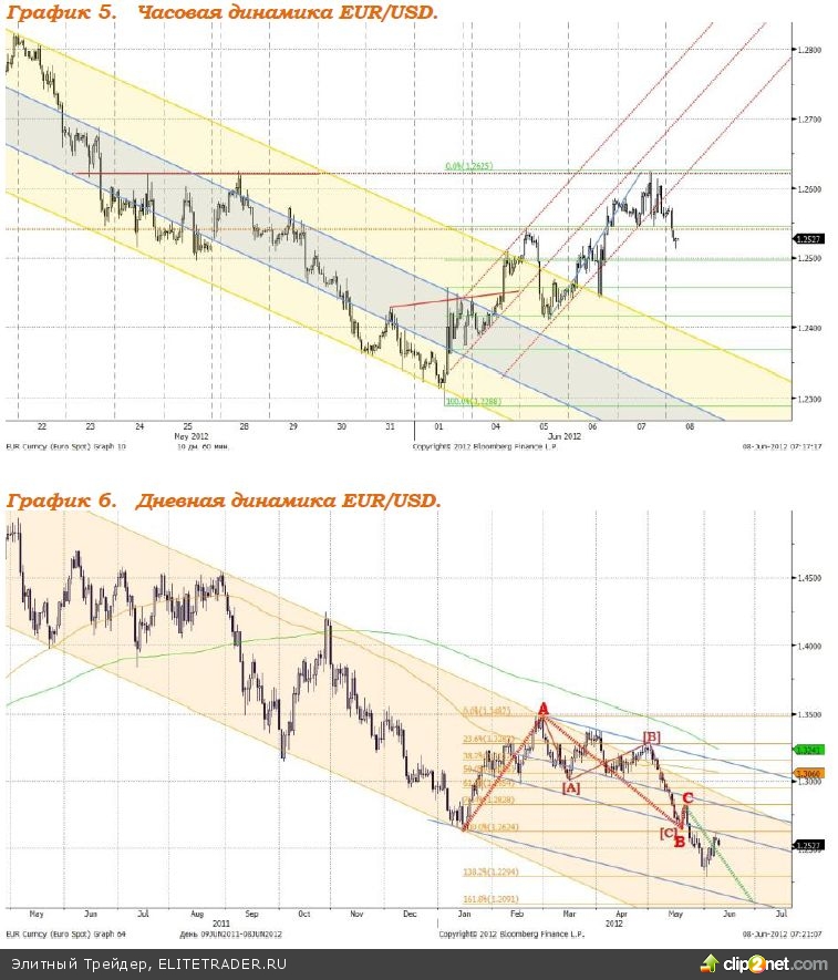 Неожиданным было вчерашнее решение Народного банка Китая сократить с сегодняшнего дня (8 июня) ставки по депозитам и по годовым кредитам. Ставки снижены на 0,25%, теперь они будут составлять 6,31% и 3,25% соответственно. Рынок отреагиро-вал на решение китайского ЦБ бодрым ростом. Валютная пара евро/доллар к вечеру достигла отметки 1,2625. Однако дальней-шие новости только разочаровы-вали участников торгов. Рейтинго-вое агентство Fitch вновь напом- нило игрокам о европейском долговом кризисе, об Испании и о высоком уровне рыночных рисков снизив рейтинг государственного долга Испании сразу аж на 3 ступени до "ВВВ" и присвоило ему негативный прогноз. Другим разочарованием для рынков стало выступление главы ФРС Бена Бернанке перед Конгрессом, на котором Бернанке вновь сказал что Федеральная резервная систе-ма следит за экономической ситуацией и готова предпринять шаги по защите экономики в случае необходимости, т.е. ББ вновь подтвердил то, что ФРС продолжает занимать в настоящее время пассивную позицию. В итоге игроки разочарованы, бычий настрой сломлен, рынки идут вниз. Пара евро/доллар снижается, начиная со вчерашнего вечера по МСК пара потеряла 1 фигуру и торгуется на отметке 1,2520. Сего-дня ждем продолжения ослабления евро к доллару до уровня 1,2450. Если взглянуть более масштабно, значение валютной пары закон-чило формирование «плоской кор- рекции» А-В-С (график 6). Валют-ная пара продолжает оставаться в рамках нисходящего канала. Конечная цель снижения значения соотношения евро и американской валюты - 1,2100. Предполагаемая структура движения котировок EUR/USD изображена на гр. 5 и 6.