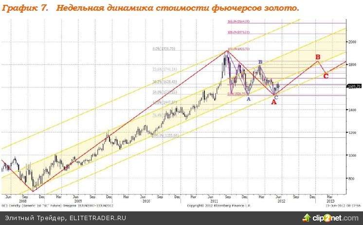 Высокая степень рыночных рисков стала причиной прекращения падения котировок золота на фоне повального падения на рынках. Драгоценный металл вновь стал выполнять функцию защитного актива, что может дать значительный импульс роста. В настоящий момент формируется волна роста «В» в рамках «плоской коррекции» А-В-С. Предполагаемая динамика развития ситуации изображена на графике 7, ориентиром повышения котировок золота служит уровень $1800.