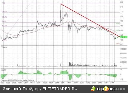 Первое, что бросается в глаза - это долгосрочный нисходящий тренд, от июня прошлого года подтягивающийся в район 118-120 рублей. Мной он нарисован с учетом прошлогодней невероятной тени свечи, так как по опыту я знаю, что в таких бумагах ими нельзя пренебрегать. Какие-то психологические аспекты там закладываются. Если акции не сдадут текущий локальный тренд 108 рублей, они могут подтянуться к сопротивлению 118-120 рублей. Но разве рост на 5-5,5% для акций "Ростелекома" - это "выстрел"? Получается что только после пробоя 118-120 рублей, может быть достойное движение до 160 рублей.