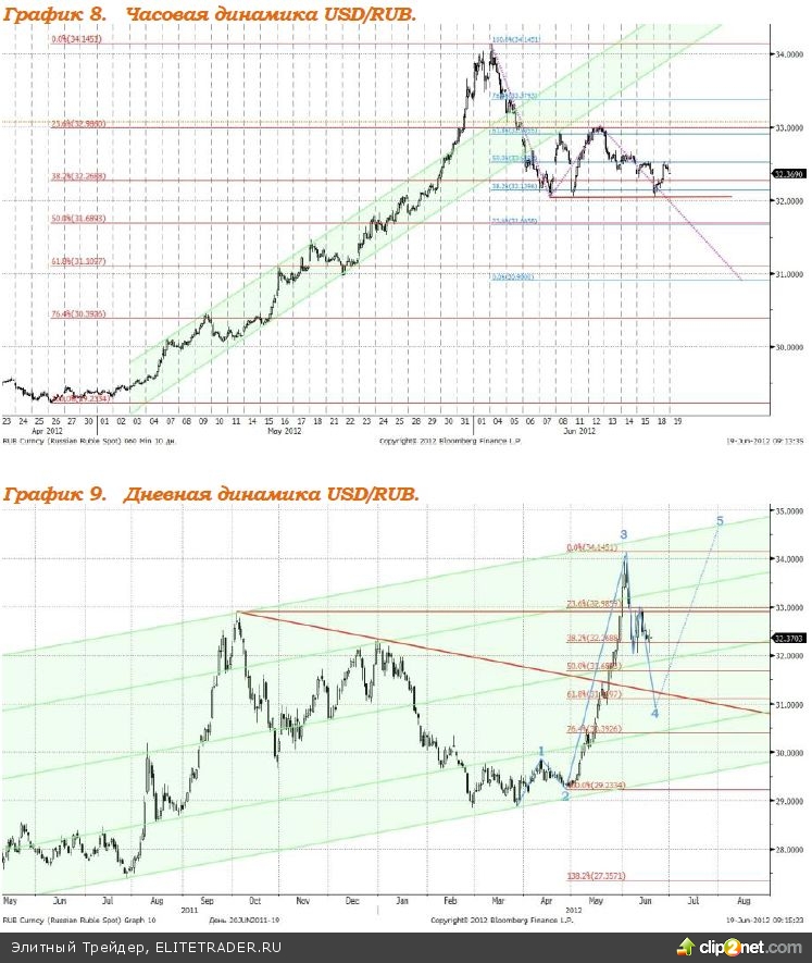 Ситуация для российского рынка может сегодня или в ближайшие дни сложиться относительно позитивно. Греки, несмотря на разногласия, демонстрируют готовность договориться. Испания близка к завершению аудита банков, что позволит получить средства от Еврокомиссии, а отсутствие согласия на переговорах по иранской проблеме могут дать толчок к росту североморской нефти, что позитивно отразится на котировках акций российских эмитентов. В зависимости от событий рубль может двинуться в ту или иную сторону. Полагаем, рубль по отношению к доллару сегодня будет находиться в диапазоне 32,25 - 32,45, пара евро/рубль будет торговаться в пределах 40,70 - 40,90 рубля за €1. Предполагаемая структура динамики соотношения доллара США и российской валюты в среднесрочной перспективе изображена на графиках 8 и 9.