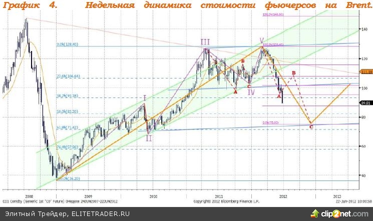 В среднесрочной и долгосрочной перспективе, высокий уровень рисков продолжает сохраняться. Прогнозируемое замедление роста мировой экономики оказывает давление на котировки нефти. В долгосрочной перспективе видим продолжение снижения стоимости Brent. Во второй половине марта было завершено формирование фазы роста, которая началась с первых дней 2009 года. В настоящее время формируется коррекционное движение вниз, которое может быть в форме зигзага, как следует из графика 4. Снижение котировок Brent может достигнуть уровня $75.
