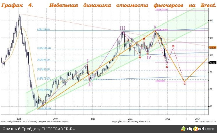 В среднесрочной и долгосрочной перспективе, на фоне негативных настроений связанных с новым обострением проблем в Европе, а также на фоне спада экономического роста в мире цены на нефть продолжили снижение. В долгосрочной перспективе видим продолжение снижения стоимости Brent. Во второй половине марта текущего года было завершено формирование фазы роста, которая началась с первых дней 2009 года. В настоящее время формируется коррекционное движение вниз, которое может быть в форме зигзага, как следует из графика 4. Снижение котировок Brent может достигнуть уровня $70.