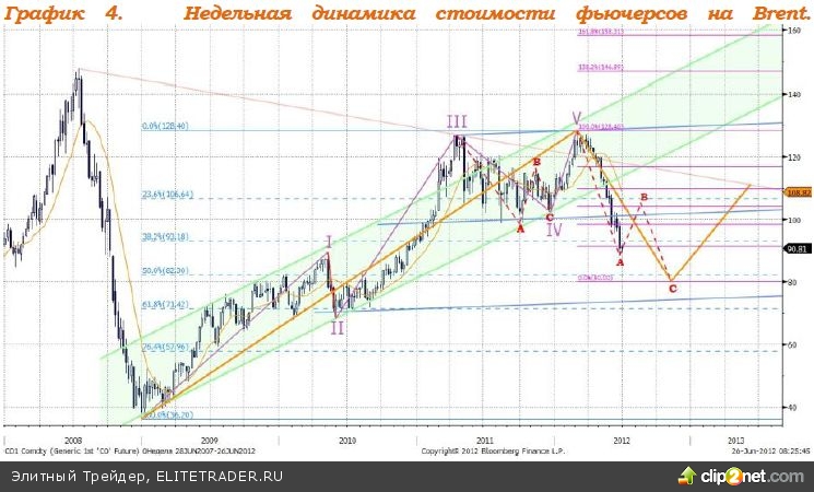 В среднесрочной и долгосрочной перспективе, на фоне негативных настроений связанных с новым обострением проблем в Европе, а также на фоне спада экономического роста в мире цены на нефть продолжили снижение. В долгосрочной перспективе видим продолжение снижения стоимости Brent. Во второй половине марта текущего года было завершено формирование фазы роста, которая началась с первых дней 2009 года. В настоящее время формируется коррекционное движение вниз, которое может быть в форме зигзага, как следует из графика 4. Снижение котировок Brent может достигнуть уровня $80