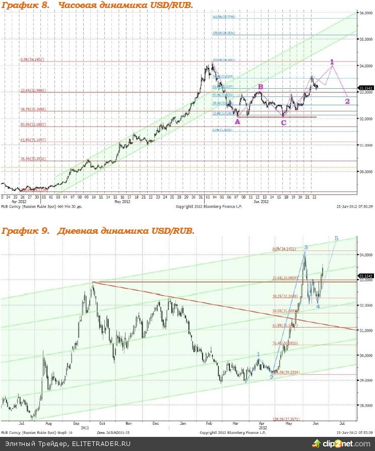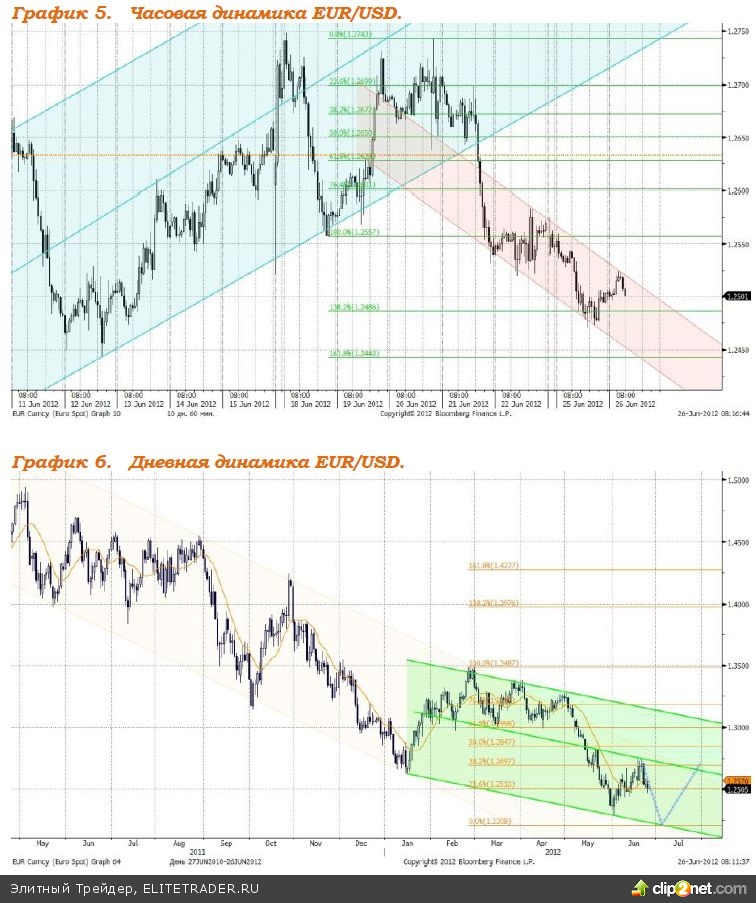 Очередную порцию негативных новостей принес вчерашний день. Рейтинговое агентство Moody's понизило рейтинг 28-и испанских банков. Снижение рейтинга составило от одной до четырех ступеней и связано с понижением рейтинга страны, которое состоялось 14 июня. Кипр официально попросил помощи, т.к. не в состоянии самостоятельно справиться с проявлениями кризиса, при этом чуть ранее рейтинговое агентство Fitch понизило долгосрочный суверенный кредитный рейтинг страны с уровня "ВВВ-" до "ВВ+". Испания официально запросило помощь для рекапитализации банков. Мадрид просит выделить сумму в €100 млрд., что значительно больше необходимой суммы в €52-62 млрд., которая была названа независимыми аудиторами. На негативном новостном фоне валютная пара евро/доллар снизилась вчера до отметки 1,2471. В настоящее время локально пара находиться в нисходящем коридоре, у верхней границы которого соотношение единой европейской валюты и доллара США находится в настоящее время. Сегодня ожидаем снижения валютной пары к уровню 1,2440. Предполагаемая структура движения котировок евро/доллара изображена на графиках 5 и 6.