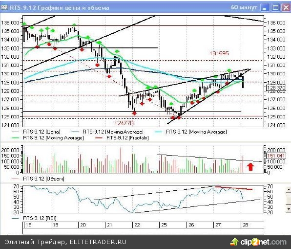 На текущий момент, уже можно констатировать выход из данной формации вниз, в подтверждении этому достаточно посмотреть на обороты торгов, которые существенно возросли. Обычно такая фигура реализовывается очень быстро, и многие участники могут попросту не успеть закрыть отрытые на отскок «лонги». А если фьючерс еще уйдет ниже отметки 124770 пунктов, которая является 61,8% коррекцией по Фибоначчи от роста 118060-135625 пунктов, то, как я уже вчера говорила, целью данного снижения станут минимумы мая, находящиеся вблизи 118 тыс. пунктов