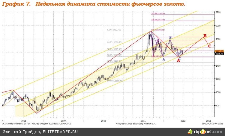 В долгосрочной перспективе продолжает сохраняться высокий уровень рисков, который стал причиной прекращения падения котировок золота на фоне падения на рынках. Драгоценный металл стал выполнять функцию защитного актива, что может дать значительный импульс роста. В настоящий момент формируется волна роста «В» в рамках «плоской коррекции» А-В-С. Предполагаемая динамика развития ситуации изображена на графике 7, ориентиром повышения котировок золота служит уровень $1800