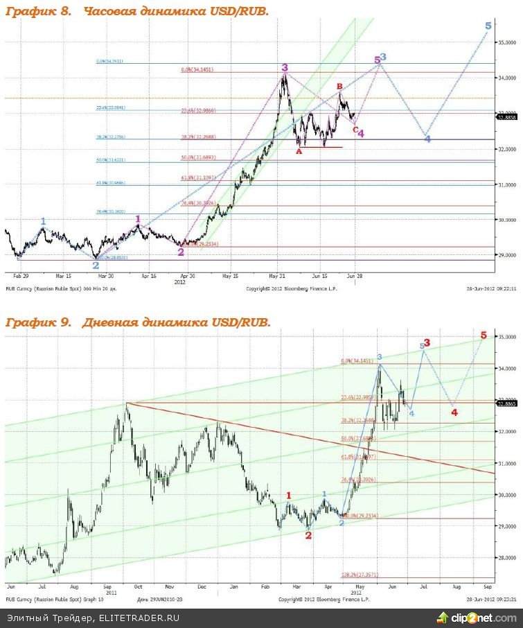 Позитивные ожидания по поводу саммита ЕС, а также снижение коммерческих запасов нефти в США, и кроме того, приближение ключевой даты по иранскому вопросу (1 июля - дата введения ограничений на поставки нефти из Ирана), стали причинами роста котировок "черного золота". Рост цен на нефть позволяет рублю укрепляться, сегодня ожидаем продолжения укрепления российской валюты до отметки 32,70 -32,75 рублей за $1, и до уровня 41,00 рубль за €1. В целом риски на рынке продолжают оставаться на крайне высоком уровне, игроки предпочитают более надежные активы, что может стать причиной дальнейшего ослабления российской валюты. Предполагаемая структура динамики соотношения доллара США и российской валюты в среднесрочной перспективе изображена на графике 9.