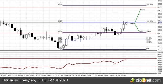 Основная рекомендация: при отскоке вниз от уровня 9 100 следует открывать короткие позиции вблизи значения 9 000 с целью фиксации прибыли около уровня 8 700. Стоп-лосс можно поставить выше отметки 9 200.