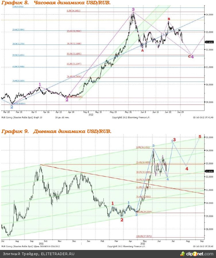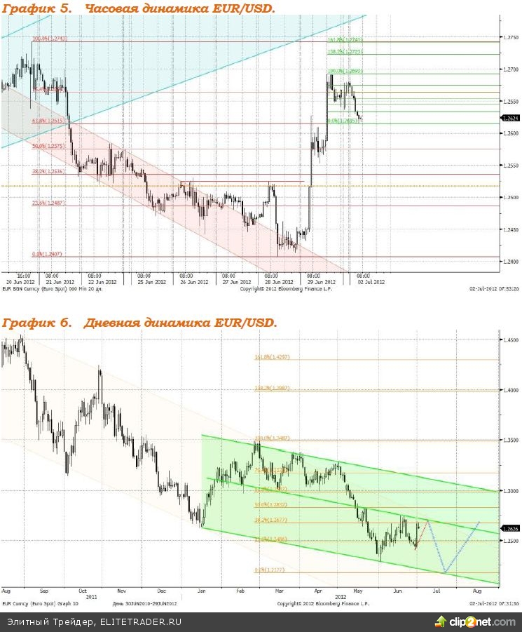 Достижение договоренности лидерами ЕС по ряду вопросов дало возможность участникам рынка надеяться на позитивное разрешение долгового кризиса в Европе. На этом фоне евро укрепляется. Полагаем соотношение единой европейской валюты и доллара сегодня будет расти к отметке 1,2750. Предполагаемая структура движения котировок евро/доллара изображена на графиках 6.