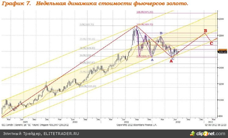 В долгосрочной перспективе продолжает сохраняться высокий уровень рисков, который стал причиной прекращения падения котировок золота на фоне падения на рынках. Драгоценный металл стал выполнять функцию защитного актива, что может дать значительный импульс роста. Драйвером роста стоимости золота также может стать смягчение еврозоной кредитно-денежной политики. В настоящий момент формируется волна роста «В» в рамках «плоской коррекции» А-В-С. Предполагаемая динамика развития ситуации изображена на графике 7, ориентиром повышения котировок золота служит уровень $1800