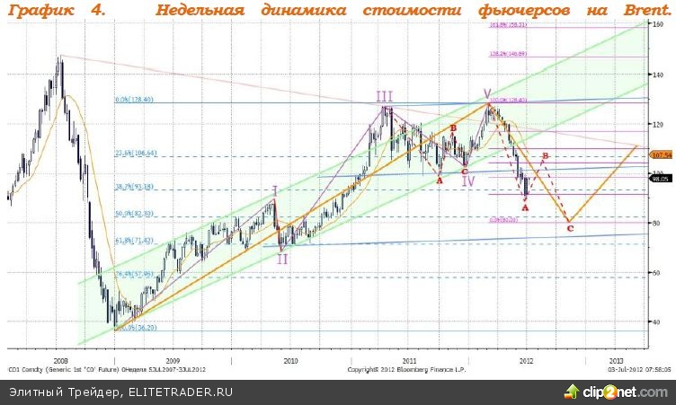 Краткосрочно, после длительного снижения котировки нефти марки Brent могут частично компенсировать снижение. Ориентир локального роста Brent- $102. В среднесрочной и долгосрочной перспективе, на фоне негативных настроений связанных с новым обострением проблем в Европе, а также на фоне спада экономического роста в мире цены на нефть продолжили снижение. В долгосрочной перспективе видим продолжение снижения стоимости Brent. Во второй половине марта текущего года было завершено формирование фазы роста, которая началась с первых дней 2009 года. В настоящее время формируется коррекционное движение вниз, которое может быть в форме зигзага, как следует из графика 4. Снижение котировок Brent может достигнуть уровня $80.