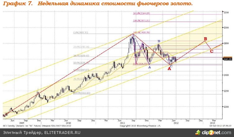 В долгосрочной перспективе продолжает сохраняться высокий уровень рисков, который стал причиной прекращения падения котировок золота на фоне падения на рынках. Драгоценный металл стал выполнять функцию защитного актива, что может дать значительный импульс роста. Драйвером роста стоимости золота также может стать смягчение еврозоной кредитно-денежной политики. В настоящий момент формируется волна роста «В» в рамках «плоской коррекции» А-В-С. Предполагаемая динамика развития ситуации изображена на графике 7, ориентиром повышения котировок золота служит уровень $1800