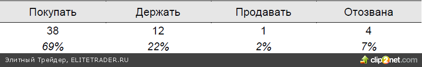 По 38 бумагам выставлена рекомендация «покупать», по 12 – «держать», по 1 – «продавать», по 4 – целевые ориентиры отозваны.