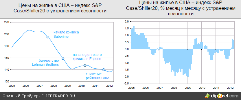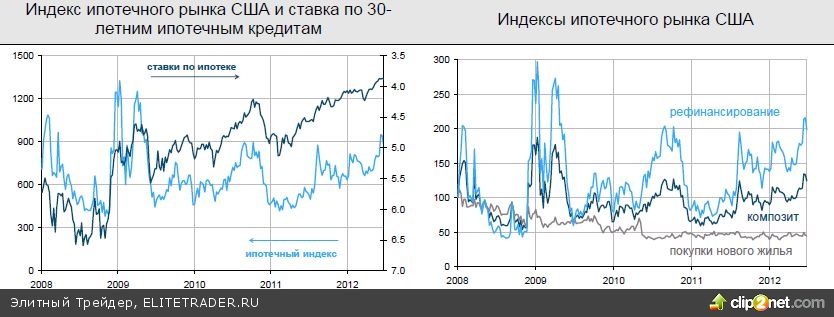 Во-вторых, о новых программах монетарного стимулирования объявил Федеральный Резерв. Напомним, что ФРС продлил программу twist (продажа коротких с одновременной покупкой длинных гособлигаций) до конца года, увеличив еѐ объем на $ 267 млрд. Мы не разделяем мнение тех, кто был разочарован действиями ФРС, т.к. в нынешней экономической ситуации в США, которая пока характеризуется пусть и замедлившимся, но ростом ВВП, требовать более агрессивных действий от регулятора, было бы преждевременно. Негативная реакция рынков была связана не с решениями ФРС, а со снижением прогноза роста ВВП на 2012 год (с 2.4-2.9 % до 1.9-2.4 %), что явилось неприятным сюрпризом для инвесторов. Первый раунд программы twist показал свою эффективность, обеспечив снижение общего уровня ставок в экономике и, прежде всего, на ипотечном рынке, что, по-видимому, и стало основной причиной некоторого оживления ситуации на рынке жилья. Как видно из нижеприведенных графиков, снижение 30-летней ставки по ипотечным кредитам ниже 4 % годовых, привело к росту индекса, характеризующего активность на ипотечном рынке, до рекордных уровней за последние 3 года. Правда, эта активизация обусловлена в основном рефинансированием прежних кредитов, в то время как количество обращений за ипотечным кредитом на покупку нового жилья, по-прежнему, невелико. Но и это весьма позитивный результат, т.к. рефинансируя свои старые кредиты под более низкие ставки, люди получают сокращение ипотечных платежей. Т.е. фактически снижение ставок напрямую ведет к росту реальных доходов населения и соответственно увеличению потребительского спроса.