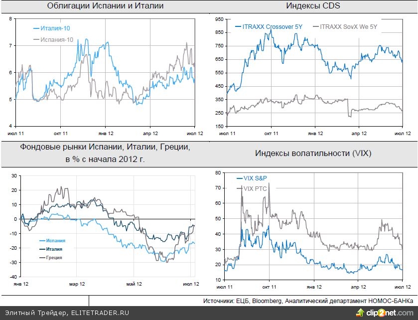 Как следует из вышесказанного, ключевым пунктом в дальнейшем развитии ситуации становится запуск ESM. И вот здесь возможны серьѐзные сложности. Помимо того, что ESM должны одобрить национальные парламенты (после того, как Германия проголосовала «за», это, скорее, технический вопрос), функционирование ESM, по крайней мере, в части кредитования банков, связывается с созданием единого финансового регулятора (такой орган будет создан при ЕЦБ). Создавая такой регулятор, европейские страны, фактически, отдают ещѐ один кусочек своего суверенитета наднациональным органам. Таким образом, движение к единому европейскому государству продолжается. Финансовые рынки воспринимают такой тренд позитивно, но в то же время есть понимание сложности этого процесса. Пока единый финансовый регулятор – это лишь декларация, никаких технических решений в этом вопросе нет. Также как нет конкретных предложений по усилению интеграции в бюджетной сфере (такие предложения должны быть проработаны лишь к октябрю).